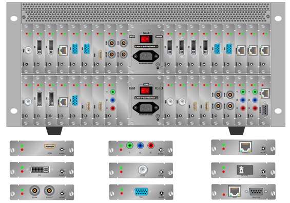 整個(gè)系統(tǒng)采用模塊化設(shè)計(jì),單卡單路,包括輸入卡、輸出卡、切換卡、控制卡、風(fēng)扇、電源等,并支持熱拔插。模塊化的設(shè)計(jì)為日常使用和維修帶來極大的方便,當(dāng)系統(tǒng)出現(xiàn)故障時(shí),無需拆開機(jī)箱就能實(shí)現(xiàn)在現(xiàn)場(chǎng)替換有故障的模塊,快速恢復(fù)系統(tǒng)正常運(yùn)行。輸入模塊和輸出模塊的熱插拔特性使得系統(tǒng)可在不斷電的情況下更換、升級(jí)輸入輸出模塊,不影響系統(tǒng)的正常工作,保證了系統(tǒng)的穩(wěn)定、靈活、可靠。