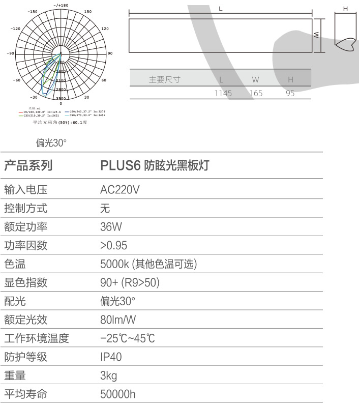 ●專(zhuān)業(yè)配光設(shè)計(jì),滿足黑板面的維持平均照度及均勻度;