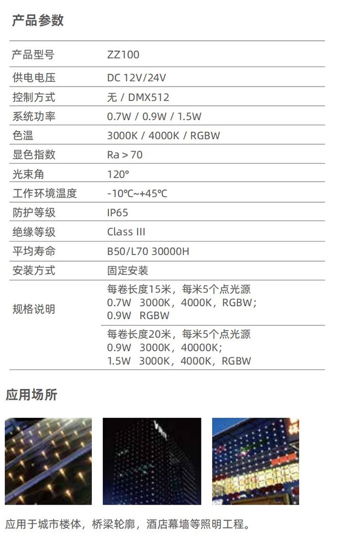 ●內(nèi)置LED光源,可根據(jù)需要發(fā)出不同的顏色,還可以內(nèi)置微電腦芯片,通過編程控制,實現(xiàn)七彩漸變、跳變、掃描、流水等全彩效果;也可以通過多個點光源像素點的陣列、造型組合來代替一定規(guī)格的顯示屏,可變化出各種圖案、文字和動畫、視頻效果;點光源是線性光源及泛光照明的一個補充。